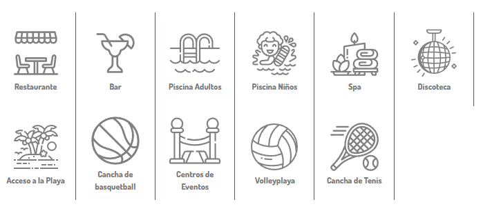 • Entretenimiento sin Fin: ¡La diversión nunca para! Contamos con 6 canchas de tenis, canchas de pádel, gimnasio, tiro con arco, deportes acuáticos no motorizados, un completo programa de actividades diurnas y espectaculares shows nocturnos en nuestro teatro, además de una discoteca para bailar toda la noche.